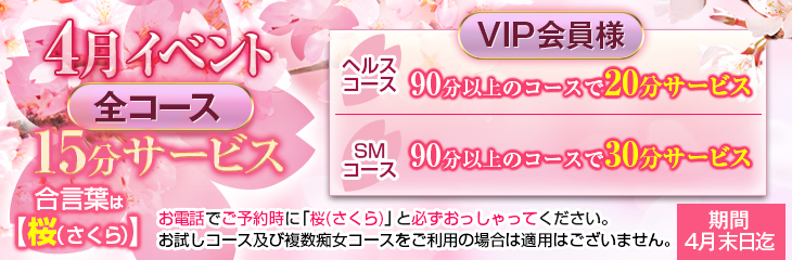 [04/01 10:00]合言葉は桜(さくら) ■御新規様 入会金3,000円が無料 さらに ・全コース 15分サービス ■VIP会員様 ・ヘルスコース 90分以上のコースで20分サービス ・SMコース 90分以上のコースで30分サー…